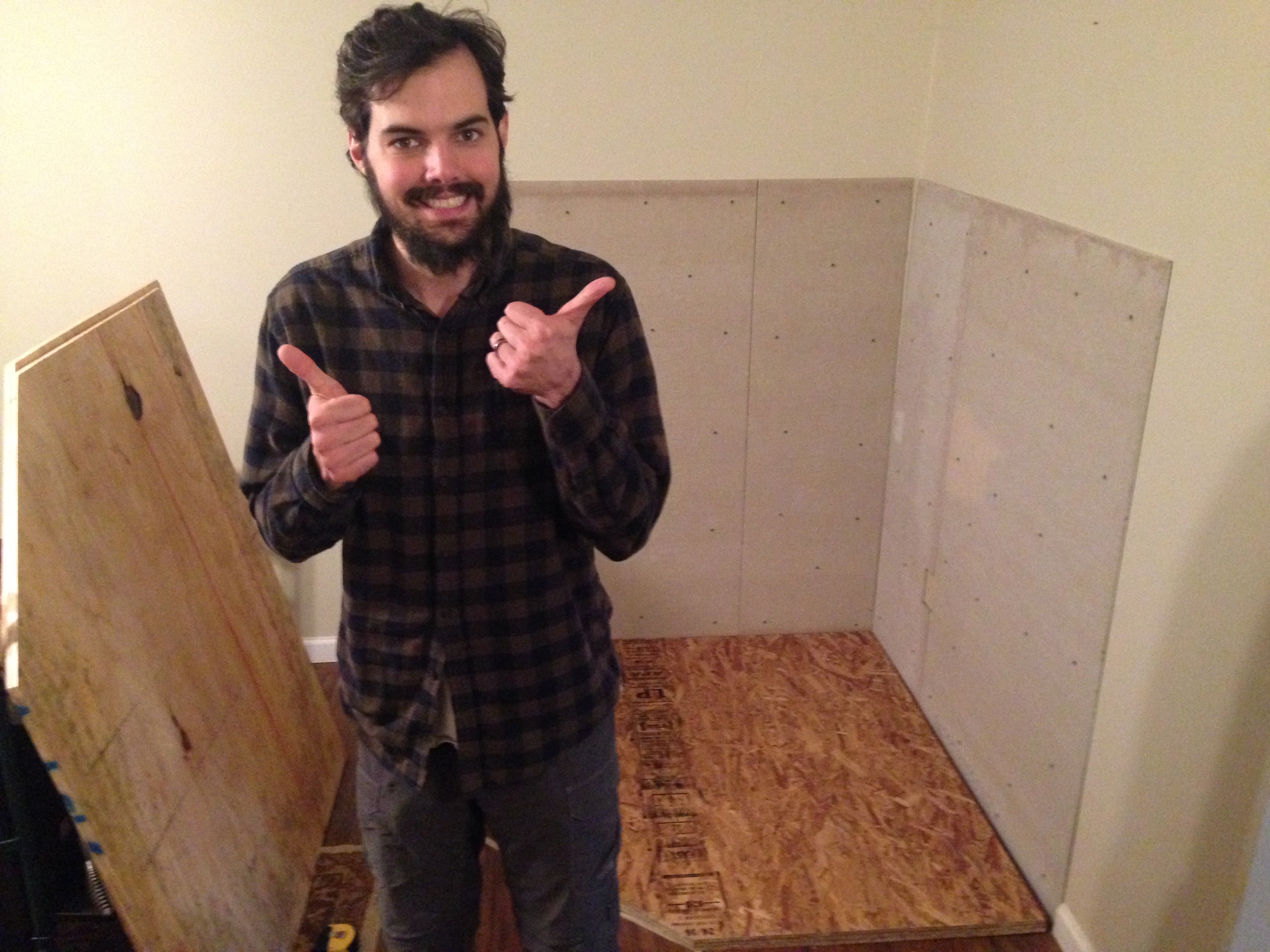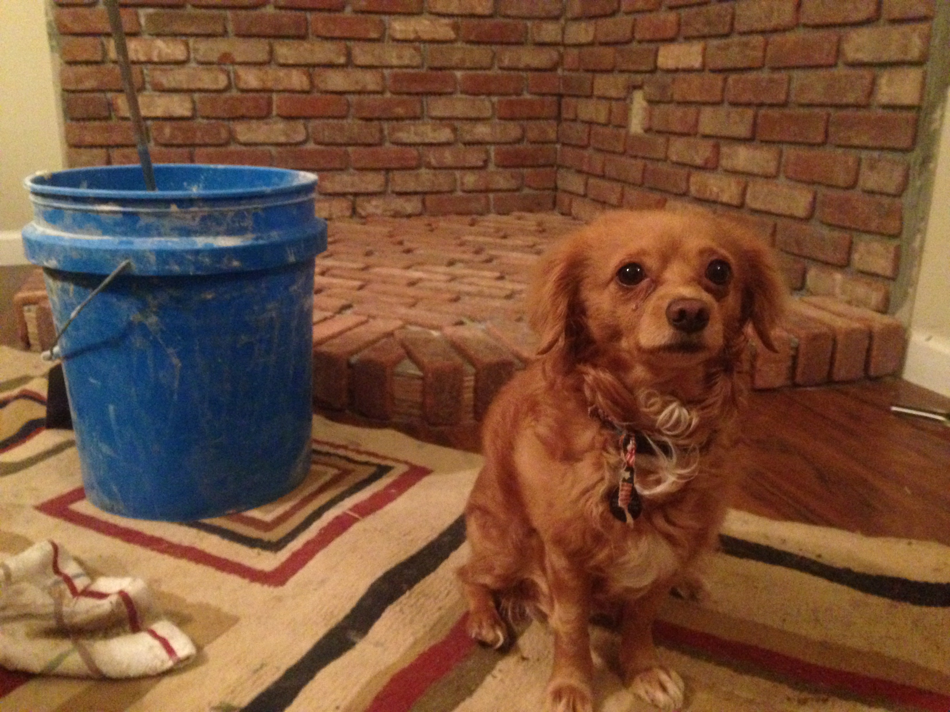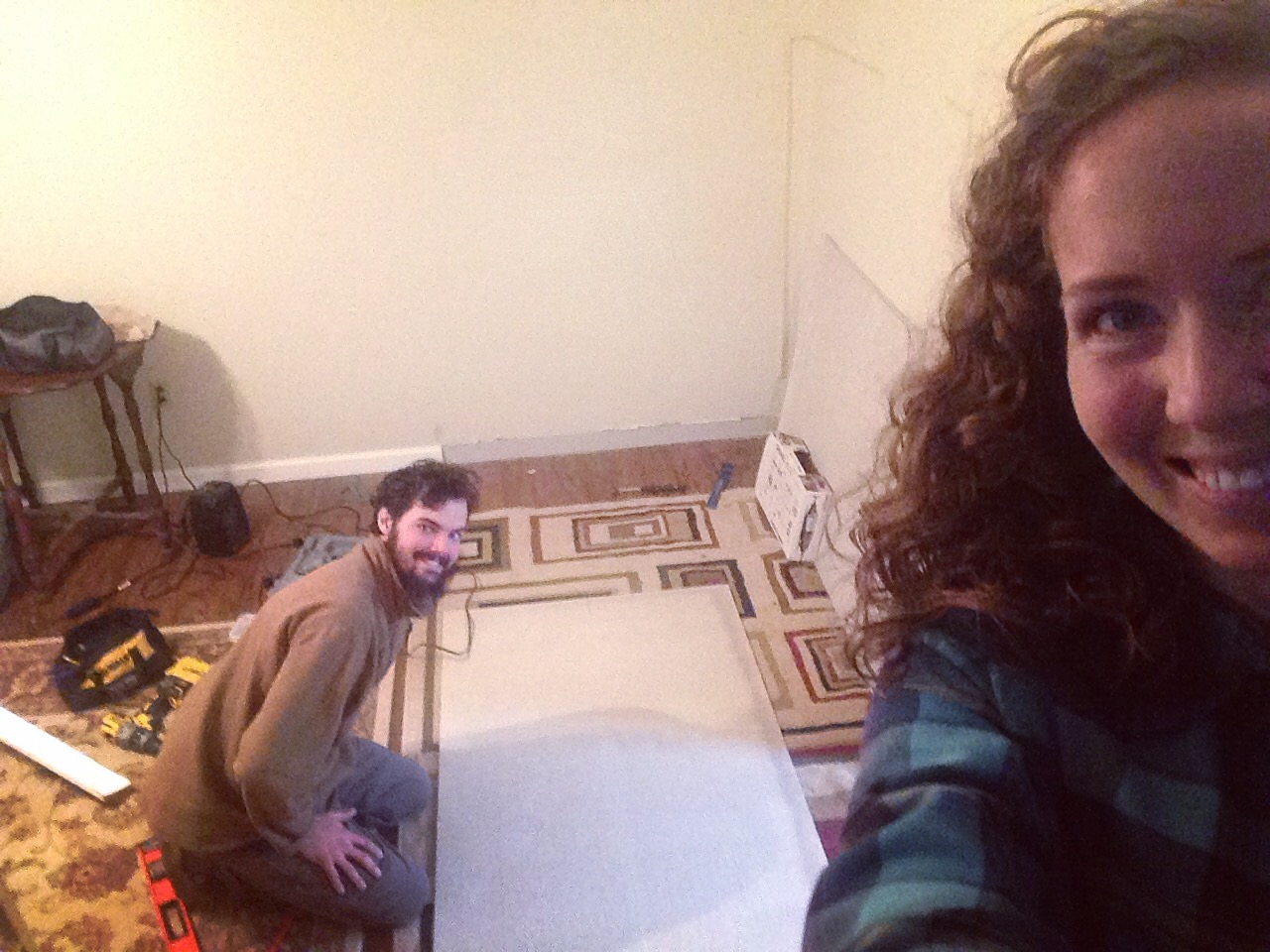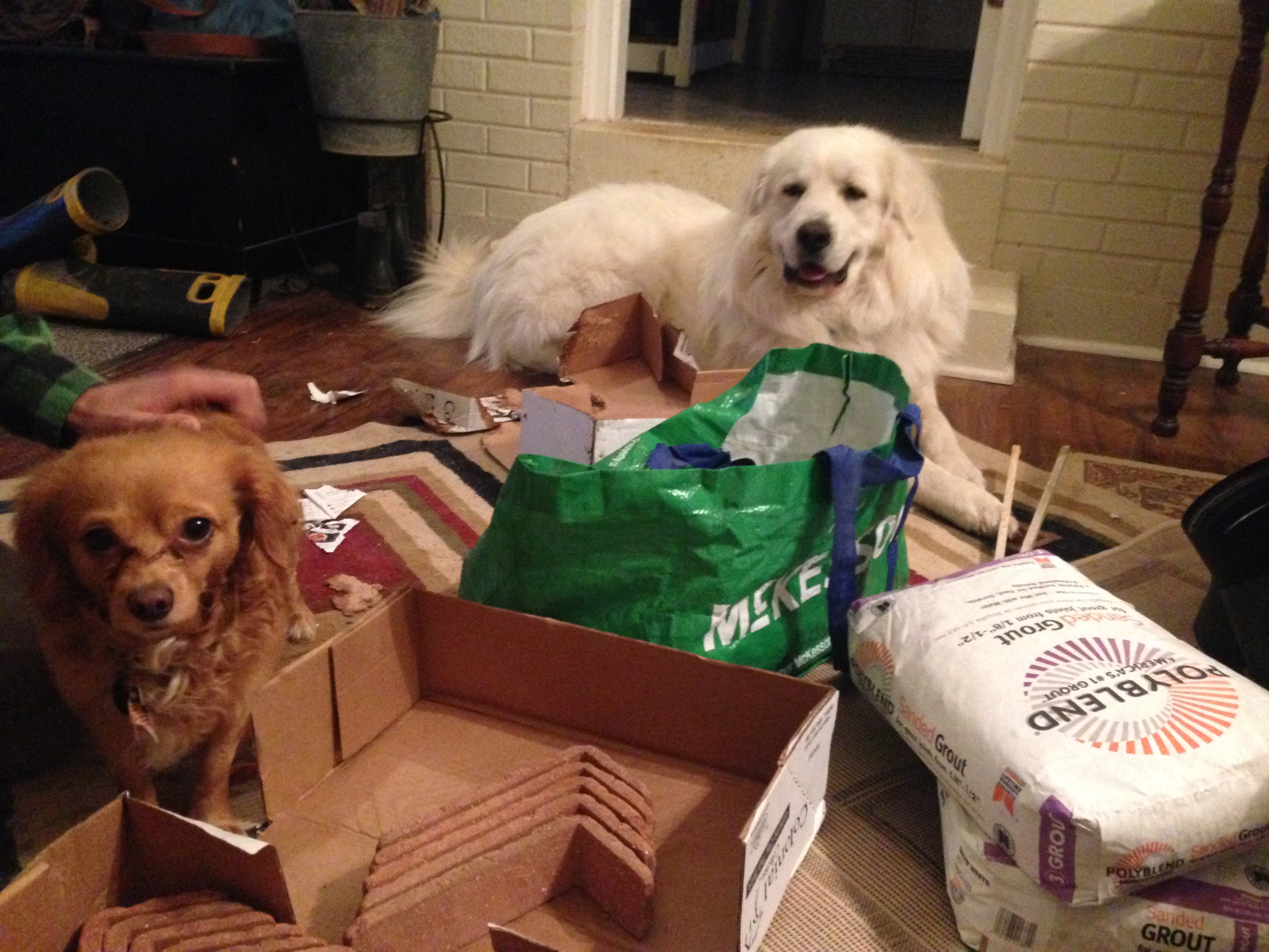 During this process, there has been a jungle of boxes in the living room- giant metal pipes everywhere, shop vac in the house to suck up the dust caused by cement board being cut (by the power tools in the house, saws and other dust/noise makers).