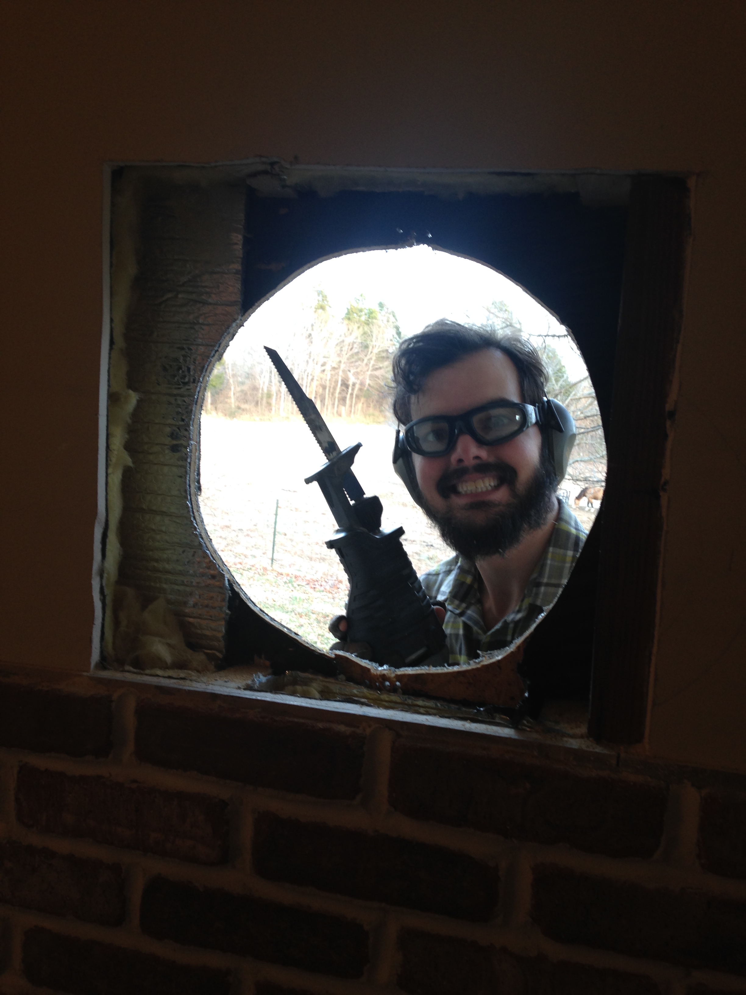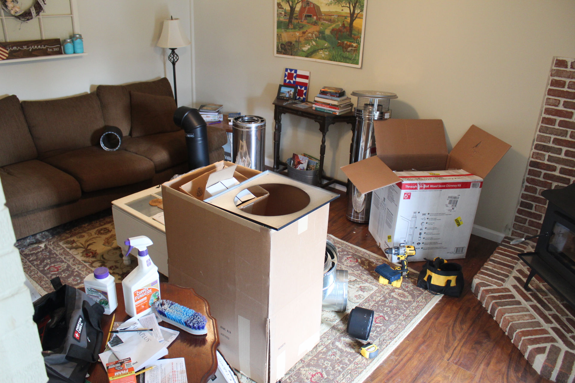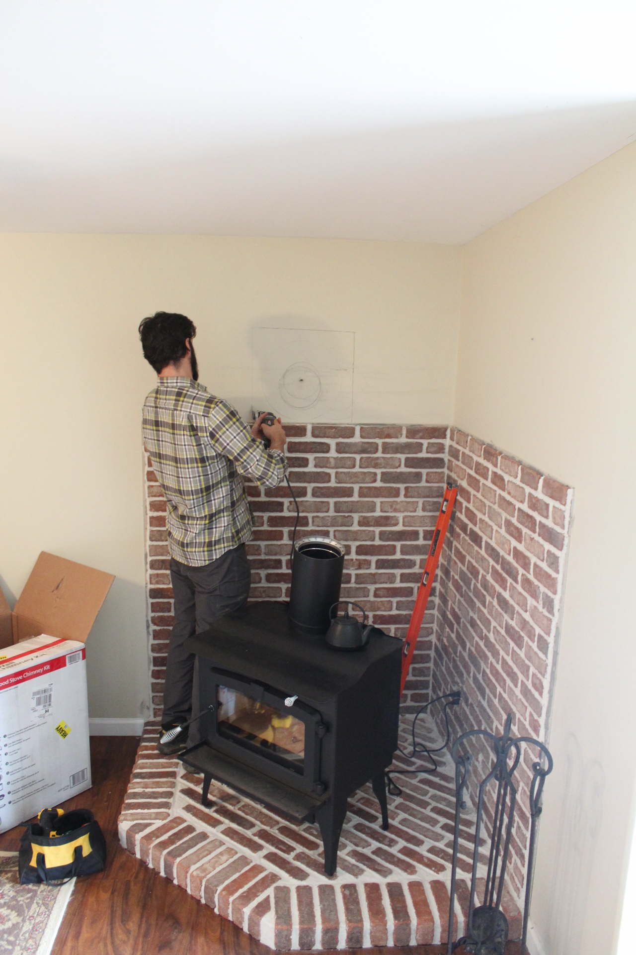 This is the big day that a hole would be made in both the wall and the overhang/roof outside. And perhaps even more importantly, the day I get the living room back! It has been a jungle of boxes and chimney pipes this whole time- the landing zone of all the materials purchased and brought home. After its all installed, I get to clean and settle into our living room again- nearly as much joy and expectation as the first fire!