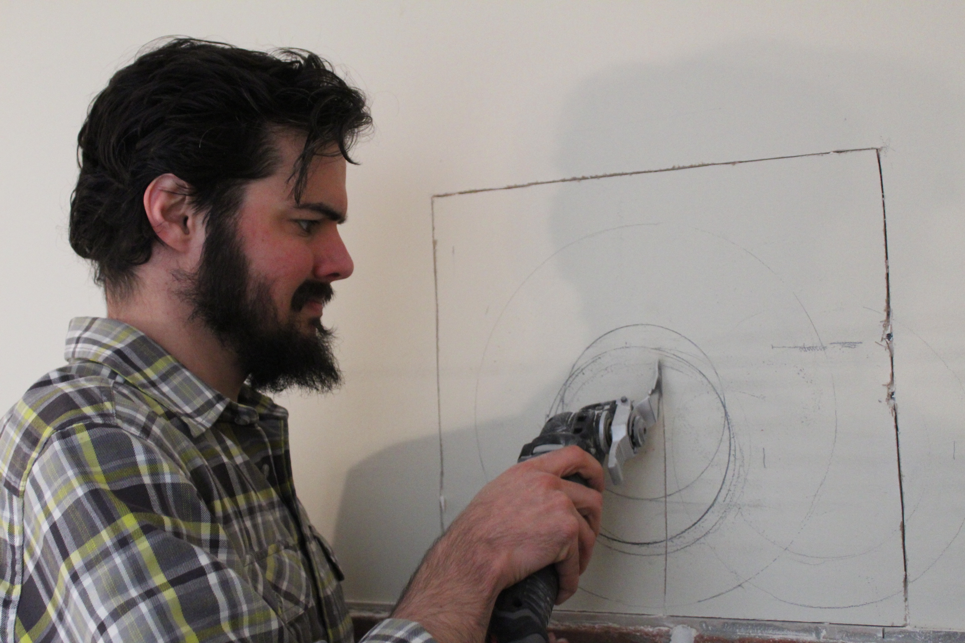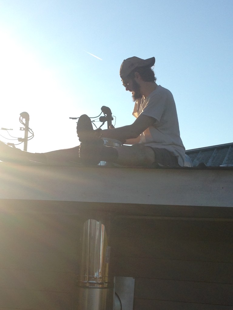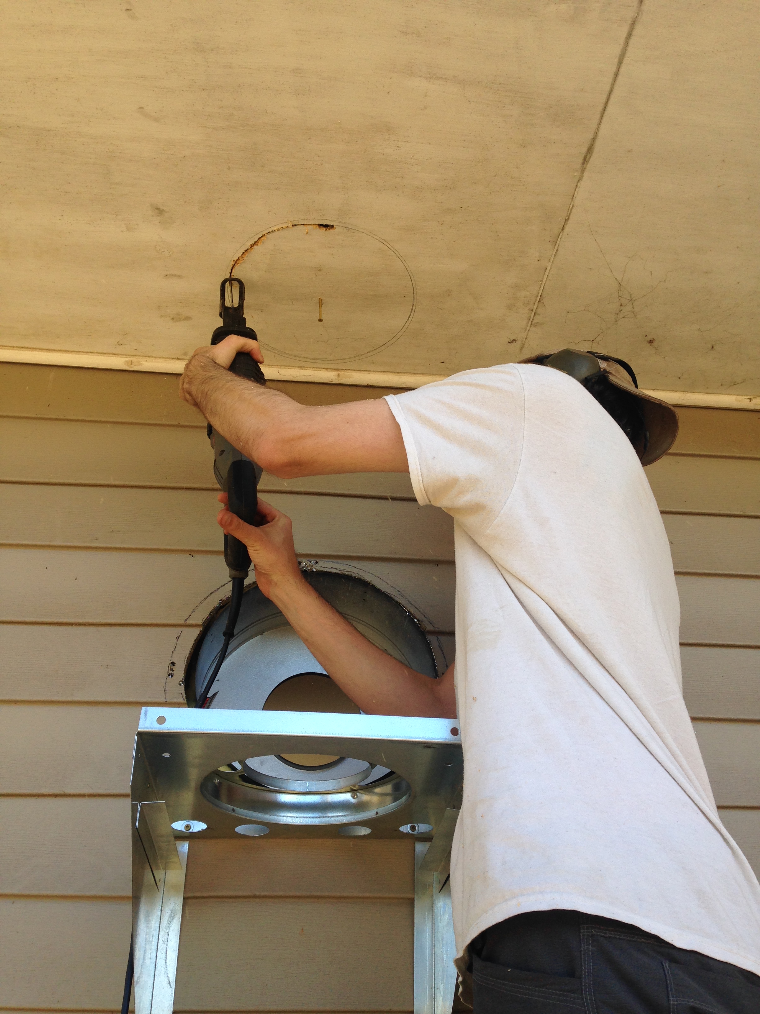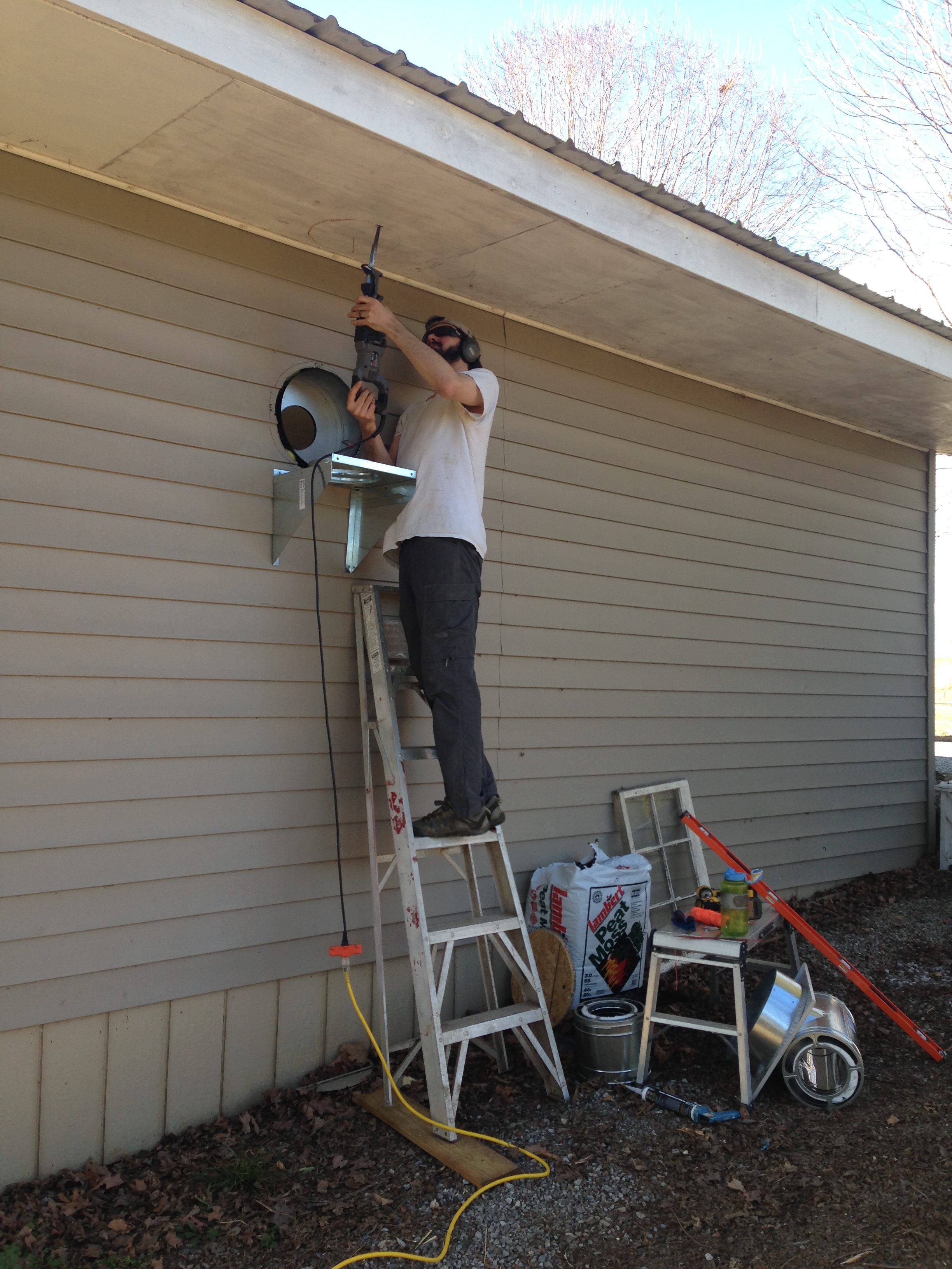 Hole made in the wall, pipe installed, then Jim monkeyed himself up to the roof for the second hole.